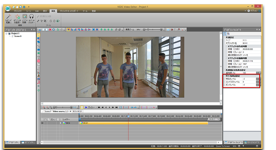 いくつかの不一致が見られる場合は、必要な調整を行います。 たとえば、光や色に関係する場合は、これらのパラメータを調整します。「ビデオ効果」≫「調整」を開いて、「輝度/コントラスト/ガンマ」を適用します。